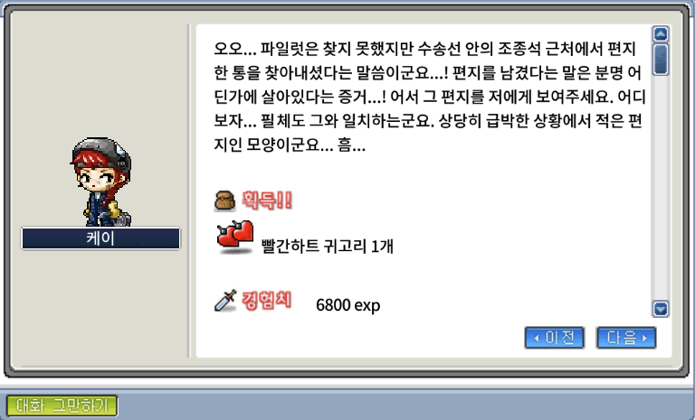그러면 보상으로 빨간하트 귀고리와 경험치 6,800을 준다.